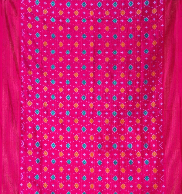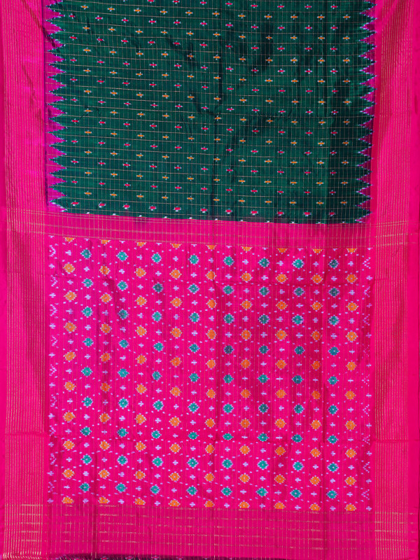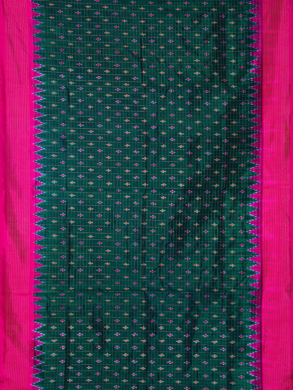 This dark green and dark pink handloom Pochampally silk Ikat saree from Telangana has beautiful patterns made using a traditional dyeing method. Pochampally Ikat is a very old weaving style where the threads are dyed before weaving, which creates unique designs. The soft mulberry silk fabric gives the saree a nice, smooth fall. The bright colours and geometric patterns make it stand out. This saree is a great choice for special occasions and for anyone who loves real, traditional Indian handloom.