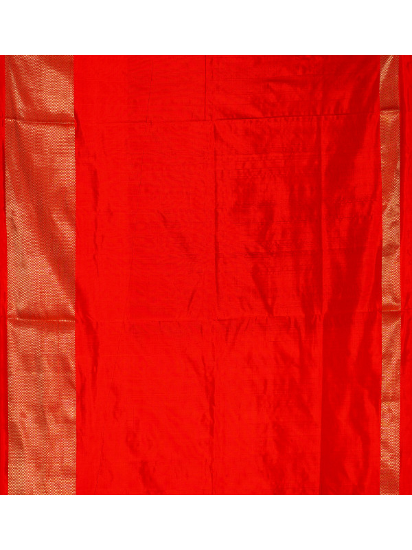 This black and red handloom Pochampally silk Ikat saree from Telangana has beautiful patterns made using a traditional dyeing method. Pochampally Ikat is a very old weaving style where the threads are dyed before weaving, which creates unique designs. The soft mulberry silk fabric gives the saree a nice, smooth fall. The bright colours and geometric patterns make it stand out. This saree is a great choice for special occasions and for anyone who loves real, traditional Indian handloom.