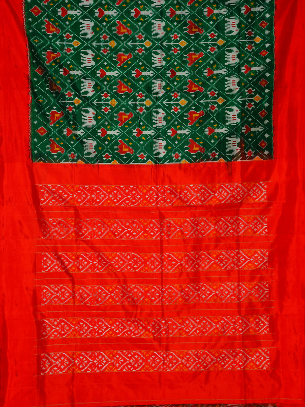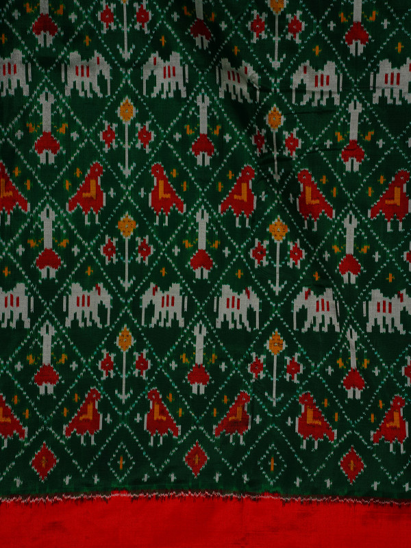 This dark forest green and red handloom Pochampally silk Ikat saree from Telangana has beautiful patterns made using a traditional dyeing method. Pochampally Ikat is a very old weaving style where the threads are dyed before weaving, which creates unique designs. The soft mulberry silk fabric gives the saree a nice, smooth fall. The bright colours and geometric patterns make it stand out. This saree is a great choice for special occasions and for anyone who loves real, traditional Indian handloom.