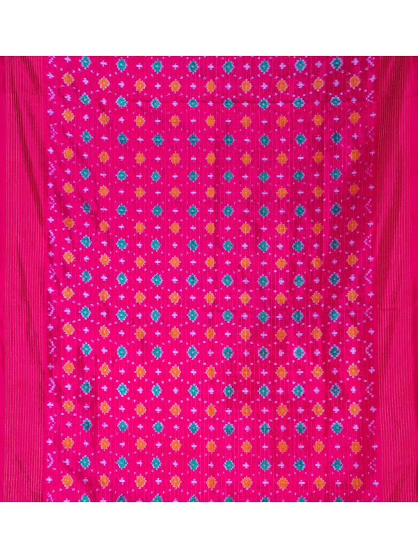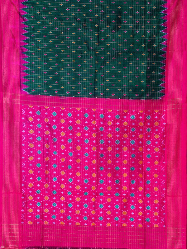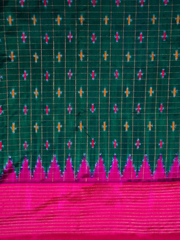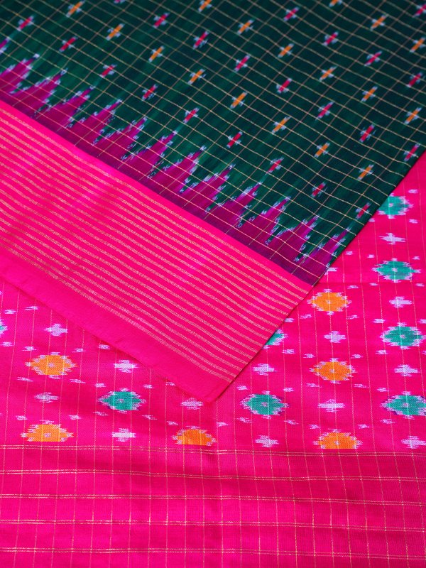 This dark green and dark pink handloom Pochampally silk Ikat saree from Telangana has beautiful patterns made using a traditional dyeing method. Pochampally Ikat is a very old weaving style where the threads are dyed before weaving, which creates unique designs. The soft mulberry silk fabric gives the saree a nice, smooth fall. The bright colours and geometric patterns make it stand out. This saree is a great choice for special occasions and for anyone who loves real, traditional Indian handloom.